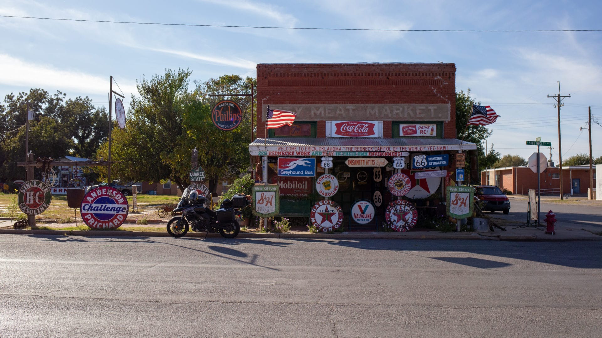 Minutes after Harley Russell unlocks his Sandhills Curiosity Shop and turns on the lights, he hands a worn Martin guitar to my dad. Russell’s shop contains several guitars, but it’s not a music store. Despite its name, nothing inside of the small brick building located just off old Route 66 in Erick, Oklahoma is actually for sale. Russell encourages guests to take all the photos they want, and he assures me that every enamel sign on display is real—but this is not a museum either.