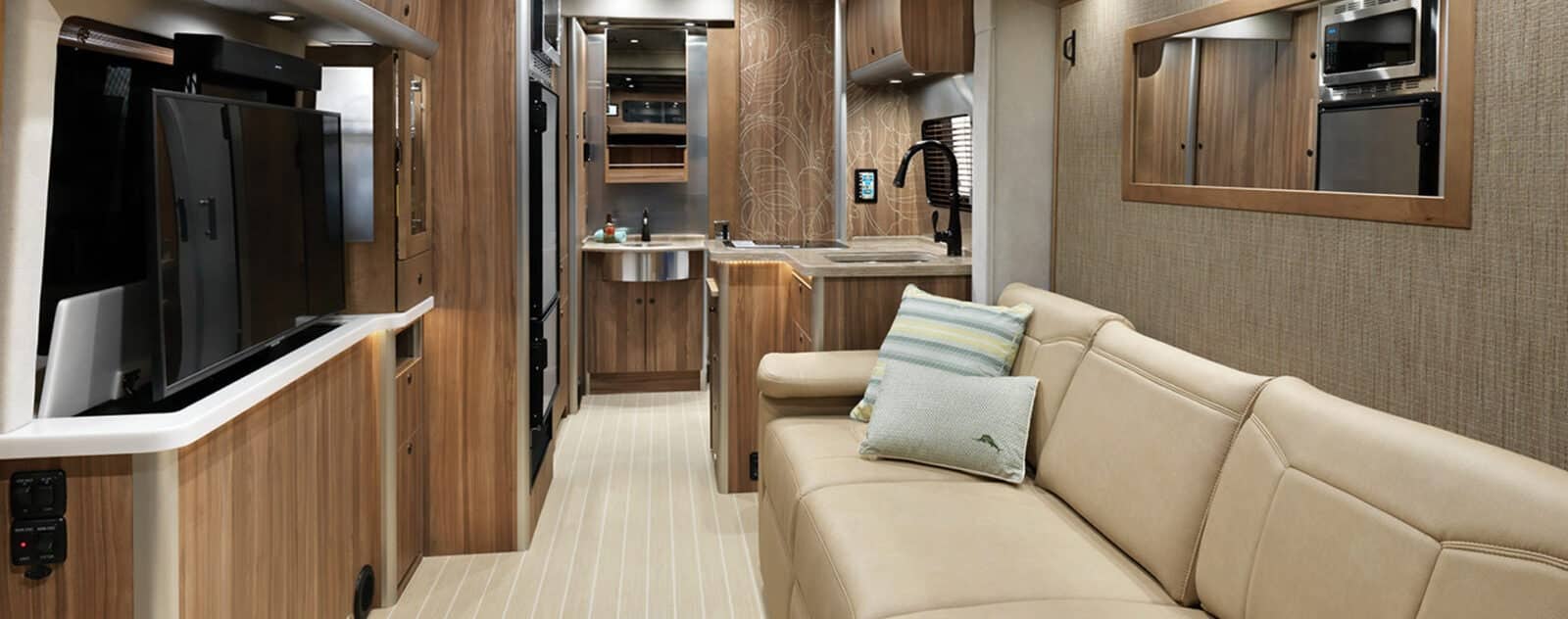 If you want a luxury Class B+, the Airstream Atlas is an impressive option with a plush interior. Here, the materials and styling matter. The Atlas is only available in one floor plan, which features a Murphy bed located on a power slide and a hidden TV.