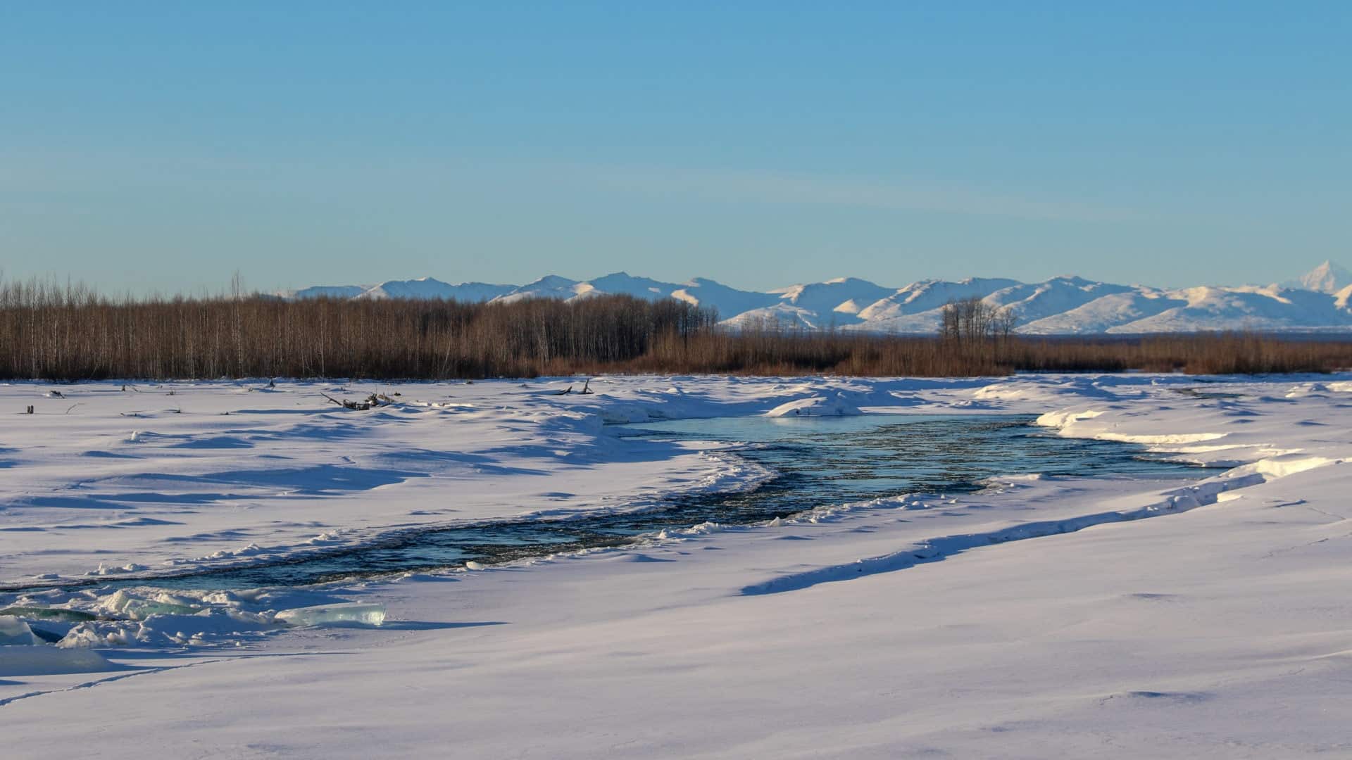I walk to the end of the road and down a short trail to the banks of the braided Talkeetna, Chulitna, and Susitna rivers. It’s been single-digit temperatures or colder for months, but great swaths of waterway are still open, a testament to the power of the trio of rivers. Because it’s a “bluebird day” (clear and cloudless), Denali and her sidekicks, mounts Foraker and Hunter, appear crisp and defined in the distance. Considering the Alaska Range is more than 60 miles away, it’s hard to fully grasp how massive these mountains are.